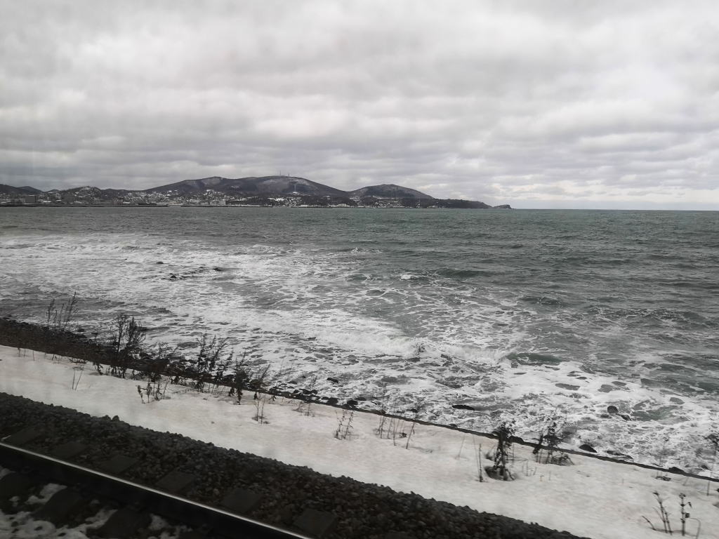 小樽へ向かう途中車窓からは、鉛色の空と寒々しい海が見えます。北の海だなあという感じがします。それでも雪が少ないのが少し寂しいです。