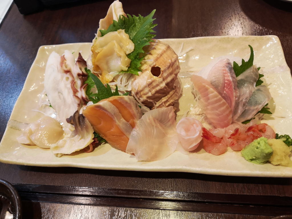 まずは、お刺身の盛り合わせをオーダー。地魚のようです。お刺身と日本酒で一杯。