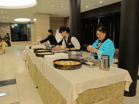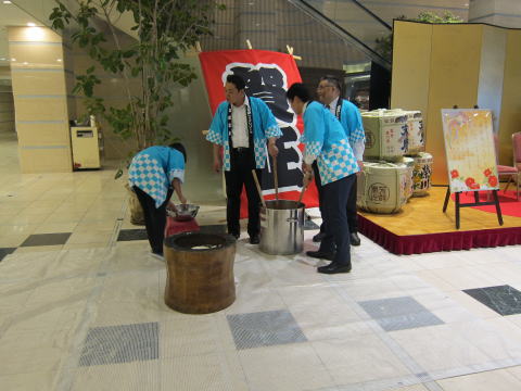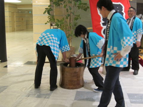 朝食が終わり、ロビーへ出ると、餅つきをやっていました。