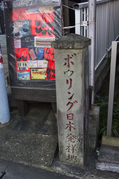 坂の途中に、ボウリング日本発祥地という碑がありました。