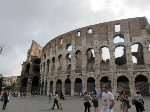 コロッセオの前で、ガイドさんから歴史や概要を聞く。当時7万人も収容できたのも凄いが、上部に布製の屋根が付いていたのは驚き。今回初めて知った。コロッセオに入場する観光客は多い。長い行列が出来ていたが、我々は団体客の入口から比較的簡単に入場。