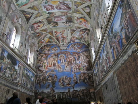 そしてシスティーナ礼拝堂へ。さすがにすばらしい壁画、天井画だ。天井に描かれている天地創造、実は見学時点では気付かなかった。ここは写真撮影禁止なのだが、フラッシュを焚かなければ分からないだろうと、何枚か隠し撮りをしていた。帰宅後に写真をチェックしていて、写っていることに気づいた。もっとちゃんと実物を見ておけば良かった・・・。