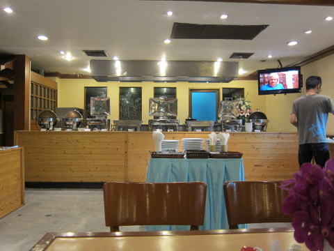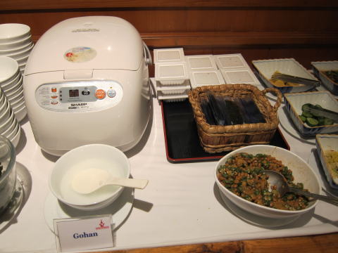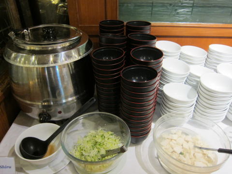 食堂の中はこんな感じ、味噌汁や納豆など。