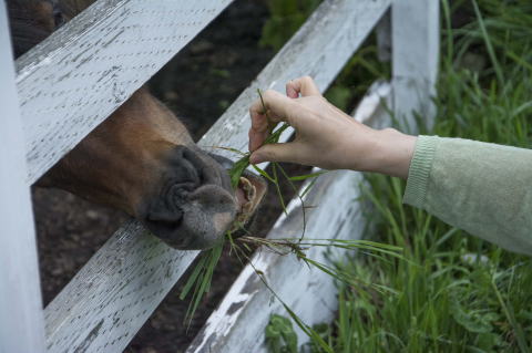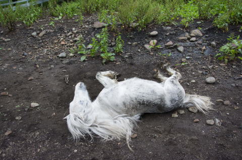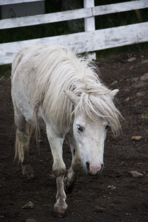 白いポニーと茶色のポニー。結構人懐こく、柵のそばに行くと寄ってきます。もう柵の中の牧草は食べきってしまったようです。柵の外の草をちぎって与えると喜んで食べます。手まで食べられそうな勢い。白いポニーは、ダニで背中が痒いのか、折角の白い体を泥にこすり付けています。雨も降り続いているので、ポニーに別れを告げて車へ戻ります。