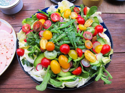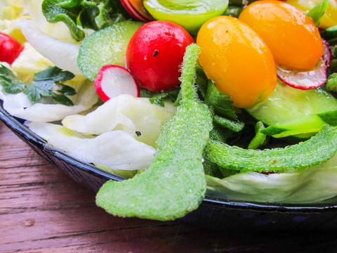 そして、この山盛りサラダ。地元の新鮮な野菜が使われています。このサラダの中に、アイスプラントが入っていました。