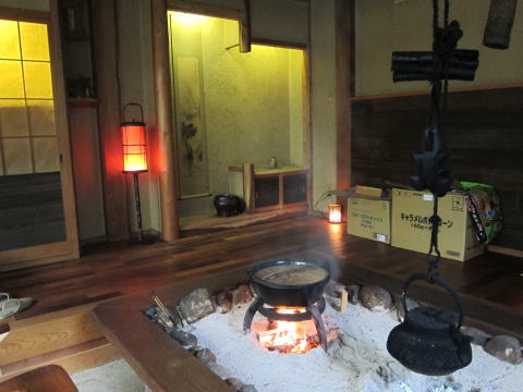 母屋の裏に囲炉裏のある別棟が建っています。こちらでお鍋を頂きます。屋根はかやぶきだそうで、とても素敵な空間です。