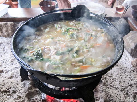 今日のお鍋は、大豆をすり潰した「ごじる」を使った鍋です。大変手間のかかったものです。そこに沢山のお野菜とお肉が入っています。味付けは「秘伝」だそうで、詳細は不明。囲炉裏でコトコトと煮込まれたお鍋は大変美味しそうです。