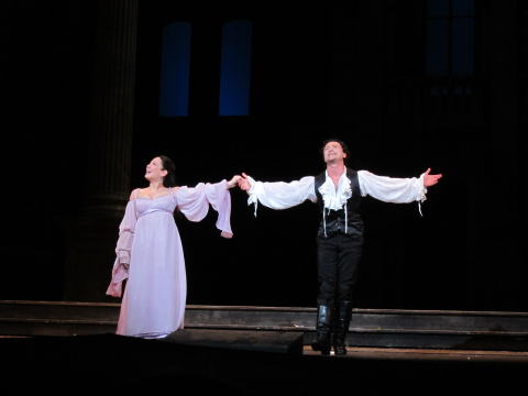 前の椅子の背もたれにディスプレイがあり、英語とフランス語の翻訳が表示される。とりあえず英語を選んだが、翻訳文を見ていると舞台に集中できないので、途中から翻訳文を追いかけるのはあきらめた。単純に音楽と、演技として楽しもう。ストーリーは大体分かっているし。