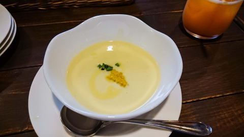 コーンクリームの冷製スープ。本当にとうもろこしの味そのもの。甘くて美味しい。