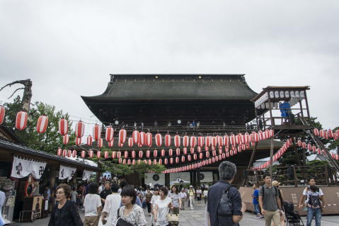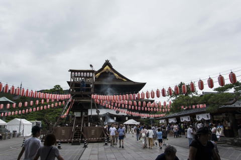 本堂。お盆の時期なので盆踊りの提灯が飾られています。