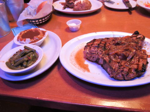 さて、ステーキ登場。おお、さすがに大きい。しかし、お皿にステーキだけとは味気ない。アメリカでは盛り付けに気を使うとか無いのでしょうか・・・。
