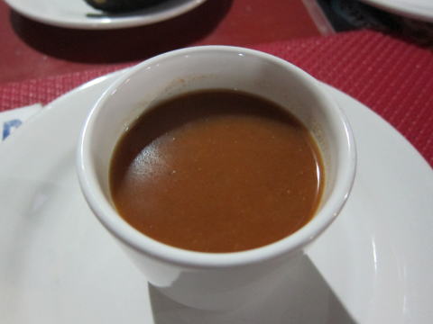 まず赤茶っぽいスープが出てきた。これは唐辛子の色かと思い、焦ったが、そうではなく、海老のスープだった。なかなか美味しい。