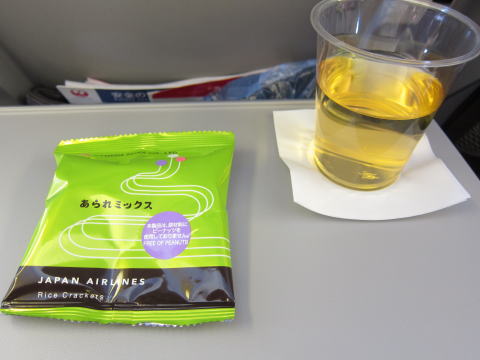 飛び立ってしばらくすると、お菓子と飲み物のサービス。ジンジャエールはエコノミーには無いとの事。しょうがないので、アップルジュースに変更。