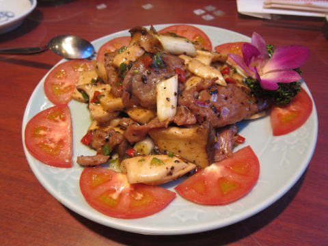 4品目:イベリコ豚とエリンギの黒オリーブソース炒め
