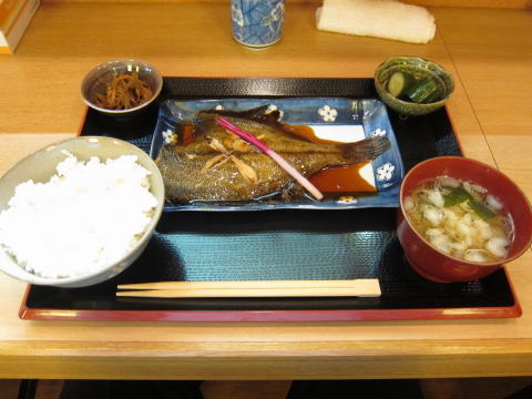 鰈の他には、味噌汁、お漬物、きんぴらごぼう、ごはん。