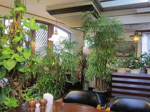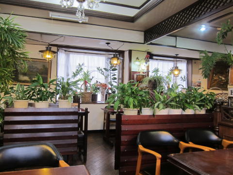 お店の中は、レトロな佇まいです。観葉植物が沢山置かれています。この観葉植物で