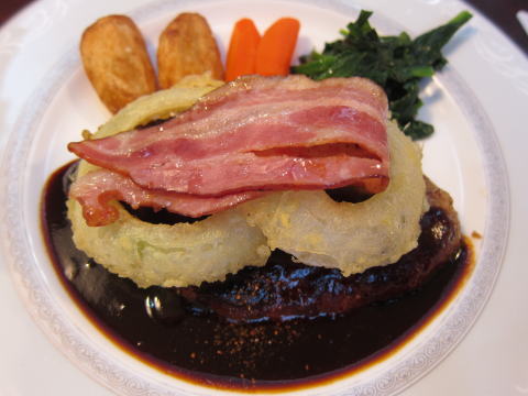 すごく大きなハンバーグですね。さらに、オニオンフライとベーコンまで乗っています。