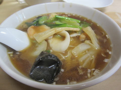 麺は細麺で餡によく絡みます。五目の具には、白菜や青梗菜の他に、イカ、鶏肉なども入っています。こちらもそれほどボリュームは多くなく、さらっとスープまで完食。
