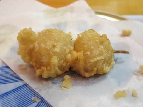 身はホクホクで美味しいです。その次は、ジャガイモの天ぷら。半分に切られ、下味が付いています。