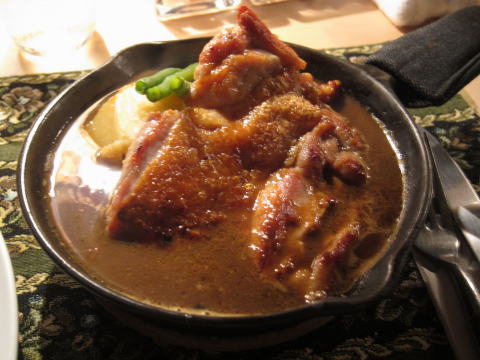 色々なカレーがありますが、私は若鳥のカレーをオーダー。オーダーの時に、ご飯の量とカレーの辛さを聞かれます。ご飯は普通にしました。辛さの指定は変わっていて、山の名前で指定します。というのも、お店の名前がアルペンで、基本コンセプトは山小屋だからです。で、辛さの指定ですが、甘い方から、順に、野毛山、富士山、キリマンジャロ、アイガー、エベレスト、天国となっています。でも基本的にあまり辛くないということだったので、私は迷わず一番辛い天国をオーダーしました。