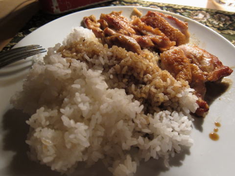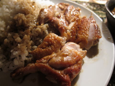 さて、一口食べてみます。確かに「天国」でもそれほど辛くはありません。丁度良い辛さです。そして、グリルされたチキンですが、皮がパリッと焼けていて美味しいです。