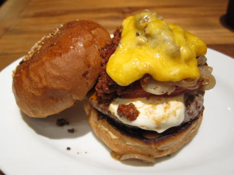 座席数は多くなく、小さいお店です。私が行ったのは夕方6時過ぎだったので、空いていました。お店の方に案内され、テーブル席へ。お店の方の対応は丁寧で感じが良かったですね。ハンバーガーのメニューは色々ありましたが、私は、焼きトマトとチリとチーズのハンバーグをオーダーしました。ポテトやドリンクは有り無しを選択可能です。