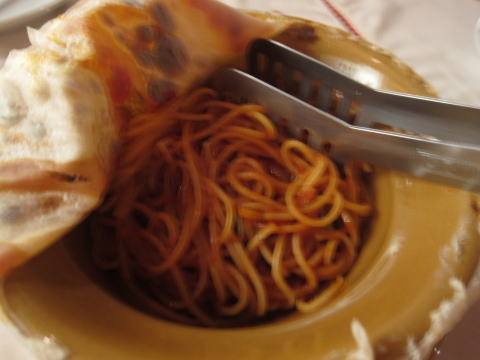 パスタ。ピザ生地で蓋をして調理しているみたい。