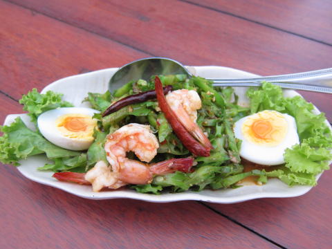 まず始めは、サラダ。エビ、唐辛子のようなもの(辛くない)、卵。