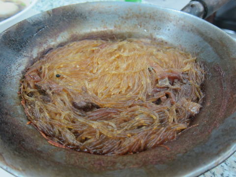 春雨と肉しか見えていないが、この中に大きなエビが隠れている。