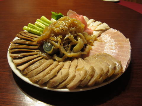 まずは前菜。ハム、チャーシュー、蒸し鳥、アスパラ、クラゲ、ピータン。