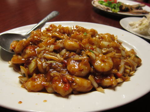 エビチリ。日本のように赤くない。ケチャップをあまり使っていないのかも知れない。