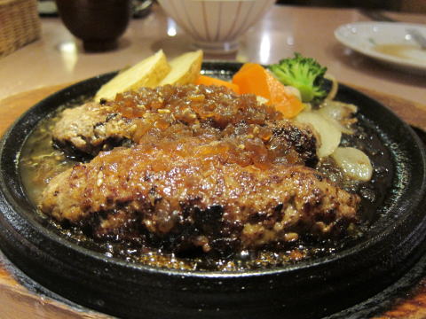そしてメインのハンバーグ登場。ここのハンバーグは砲弾型をした状態で焼き、お客さんにサービスする前に、鉄板皿の上で半分に切ってソースをかけるという、ハングリータイガーのパクリ方式です。