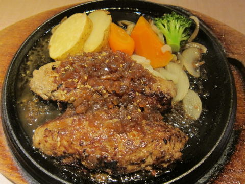 さて、ハンバーグの味ですが、かなり粗挽きの感じです。でも肉汁たっぷりという感じはあまりしません。半分に切る時に流れ出てしまうからでしょうか?味自体は別に問題ありませんが、あまりふわっとしたハンバーグとは言えませんね。それと、和風オニオンソースが結構濃い味です。デミグラスソースの方が良かったかも。