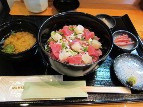 単にネギトロだけではなく、マグロブツ、ホタテの刺身まで乗っています。それにお味噌汁と、小鉢付き。100円プラスで大盛りもできるそうですが、今日は普通にしました。