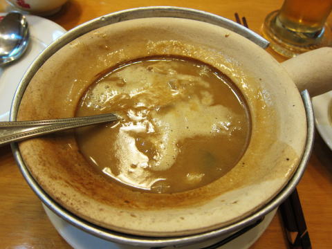 いきなりフカヒレ登場です。取っての付いた素焼きの鍋に入ってきました。フカヒレは残念ながら姿煮ではありませんでした。(安いコースだったので・・・)。それでもちゃんとフカヒレは入っています。また、スープが豚骨のような感じで、非常に濃厚なスープです。