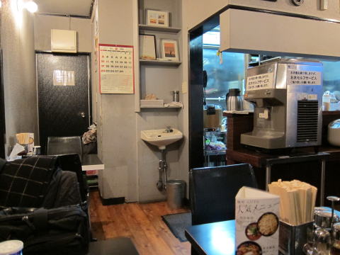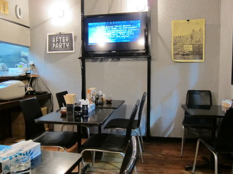 店内に入ると、さすが大学生が多い町、店内ロックのビデオと音楽が流れています。座席は、カウンターが無く、テーブル席のみ。オーダーは食券購入方式です。