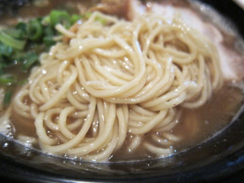 まずはスープを一口。基本豚骨ですが、魚貝系の味が引き立っています。美味しいです。さて、麺を一口。おお、つるつるの中細麺です。コシもあって美味しいです。