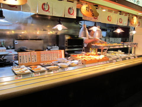 入り口を入ると、お惣菜が沢山並んでいて、自分の食べたいものを選ぶ方式です。会計の所で、ご飯と味噌汁をオーダー。ご飯は大・中・小から選択できます。