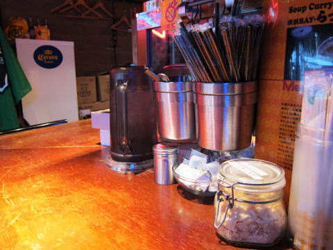 外観はちょっと変わった感じですね。南国風というか。店内に入るとバーのような感じ。先ほど言ったように、カウンターのみです。店内の大きな写真は撮れなかったんですが、カウンターの上はこんな感じです。