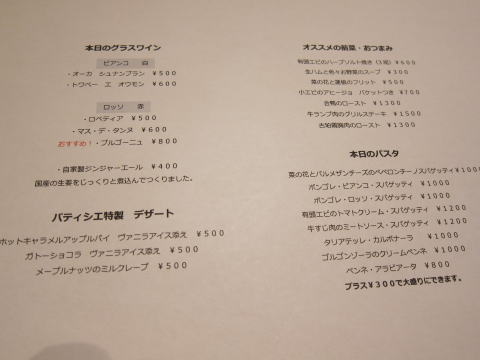 ここはピザが人気ですが、パスタも色々あります。メニューの一部をご紹介。