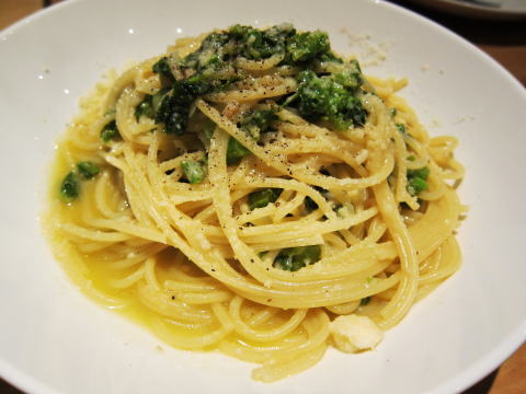 菜の花とパルメザンチーズのペペロンチーノスパゲティ。あっさりしていますが美味しいです。