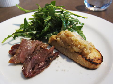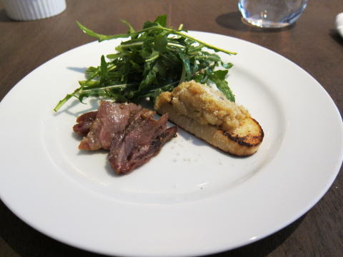 前菜は、ブルスケッタと、羊のグリルとサラダです。ブルスケッタは、自家製パンの上に、ソラマメのペーストが乗せられたもの。羊は、ピンクケッパーなどで味付けされブロックでグリルしたものをスライスしたものです。サラダは、ルッコラのサラダです。