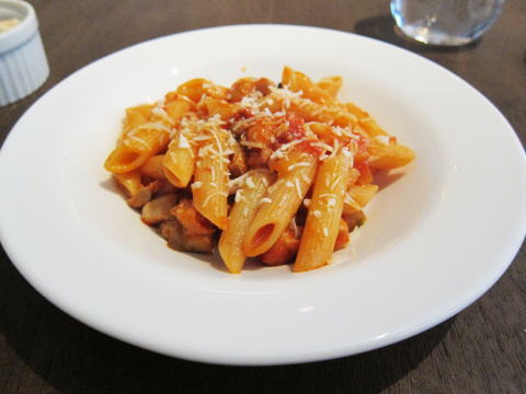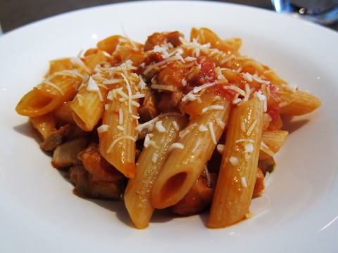 続いて、パスタです。今日のパスタはペンネで、鶏肉とオリーブ、アンチョビが入ったトマト味のパスタです。上にはペコリーノ・ロマーノのチーズがかかっていました。ペンネはしっかりした歯ごたえで、鶏肉、オリーブの味もしっかりして美味しかったです。量的には100gとのことでしたが、私はもう少しあっても良かったです。