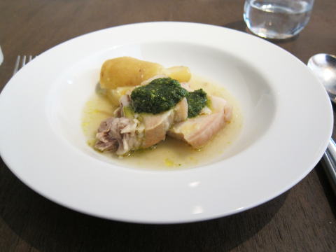 さて、メインです。皮付きアグー豚のポリートです。だし汁でアグー豚を茹でたものですね。肉の上には、パセリ、ニンニクなどが混ざったソースがかかっていました。付け合せにじゃがいもが添えられていました。お肉は物凄く柔らかく煮込まれています。スープも美味しかったです。