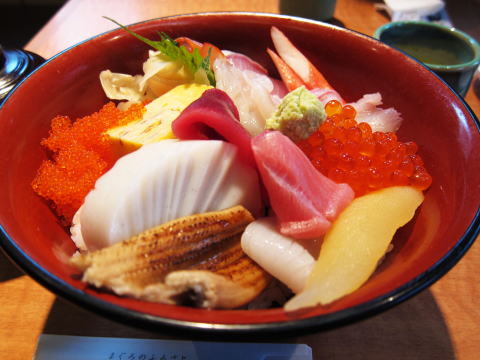 マグロ2種類、イカ、アナゴ、白身魚、数の子、いくら、とび子、かまぼこ、卵焼き、かに、と盛りだくさん。マグロはさすがに良い物で、美味しかったです。今度は、マグロの三種盛りでも頼んでみようかと思います。