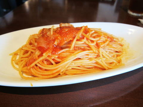 なかなか美味しい前菜でした。続いてパスタです。パスタは、パンチェッタのトマトソースのパスタです。