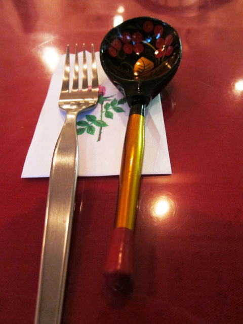 私は、ボルシチ、ペリメニ、ひき肉のピロシキをオーダーしました。最初にフォークとスプーンが運ばれて来ました。スプーンがかわいいですね。