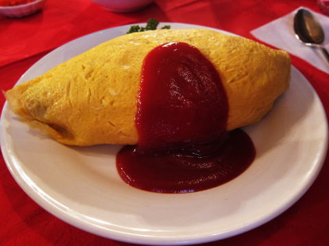 まず一口、おお美味しい。中はちゃんとケチャップライスですね。それもチキンライスではなく、肉の代わりに厚切りのハム、そして海老が結構沢山入っています。これが美味しいです。玉子も「裏」にしてトロトロ感をアピールすることなく普通に見えますが、食べてみると中はトロトロ。バターが利いていて美味しいです。