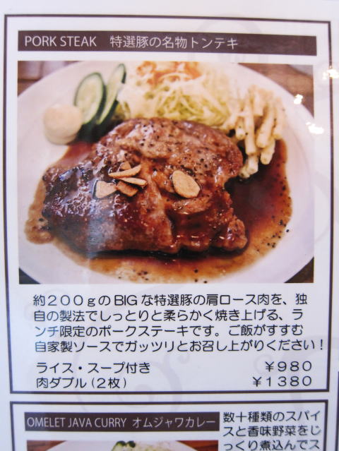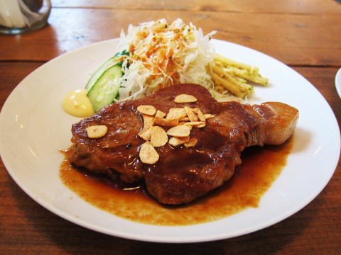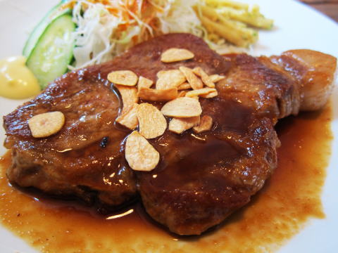 で、ナイフを入れてみると・・・、しっかりした肉の食感はありますが、適度な柔らかさです。食べてみても、しっかりと肉の感触があり、味も美味しいです。ソースの味付けも合格。まあ、トンテキというか、厚切り肉のポークソテーですよね。脂身もしつこくなく、あっさりと完食しました。