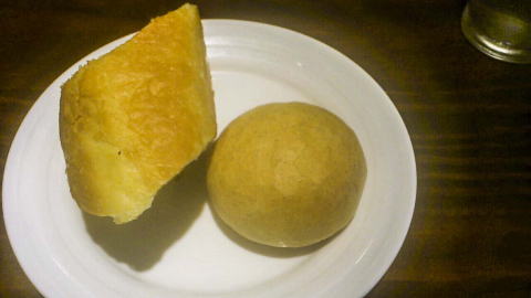 写真左側は、キャベツ、タコ、ネギなどが入ったペペロンチーノ、右側は、トマトソースに荒引きの肉が入ったパスタです。パスタ自体は少し細めで、アルデンテ。大変美味しいです。さっきパンを全部食べないで、残しておけばソースを付けて食べられたのに、と思っていたら、お店の方が「パンのお代わりは如何ですか?」と聞いてくれました。ラッキー。遠慮なくパンのお代わりを頂きました。パスタを食べ終わった後は、パンをソースに付けて綺麗に完食。もうおなか一杯。凄いボリュームでした。